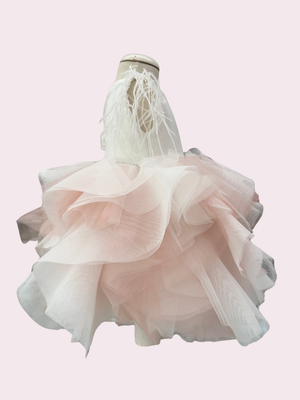 Corpino brillè con punti luce sul girovita. Gonna multistrato in tulle e maniche in piuma. Fascia abbinata. Abito sartoriale Made in Italy.
