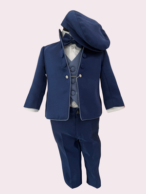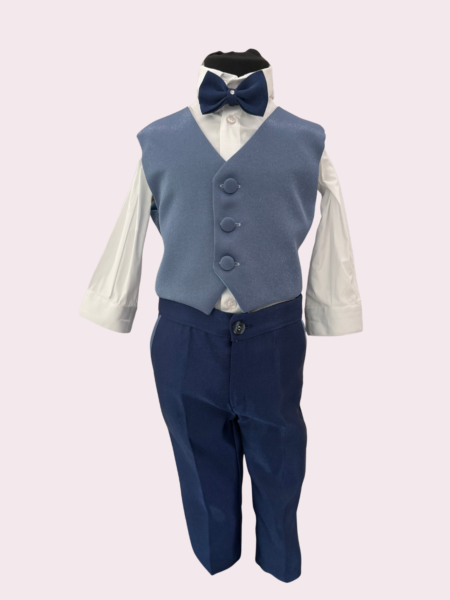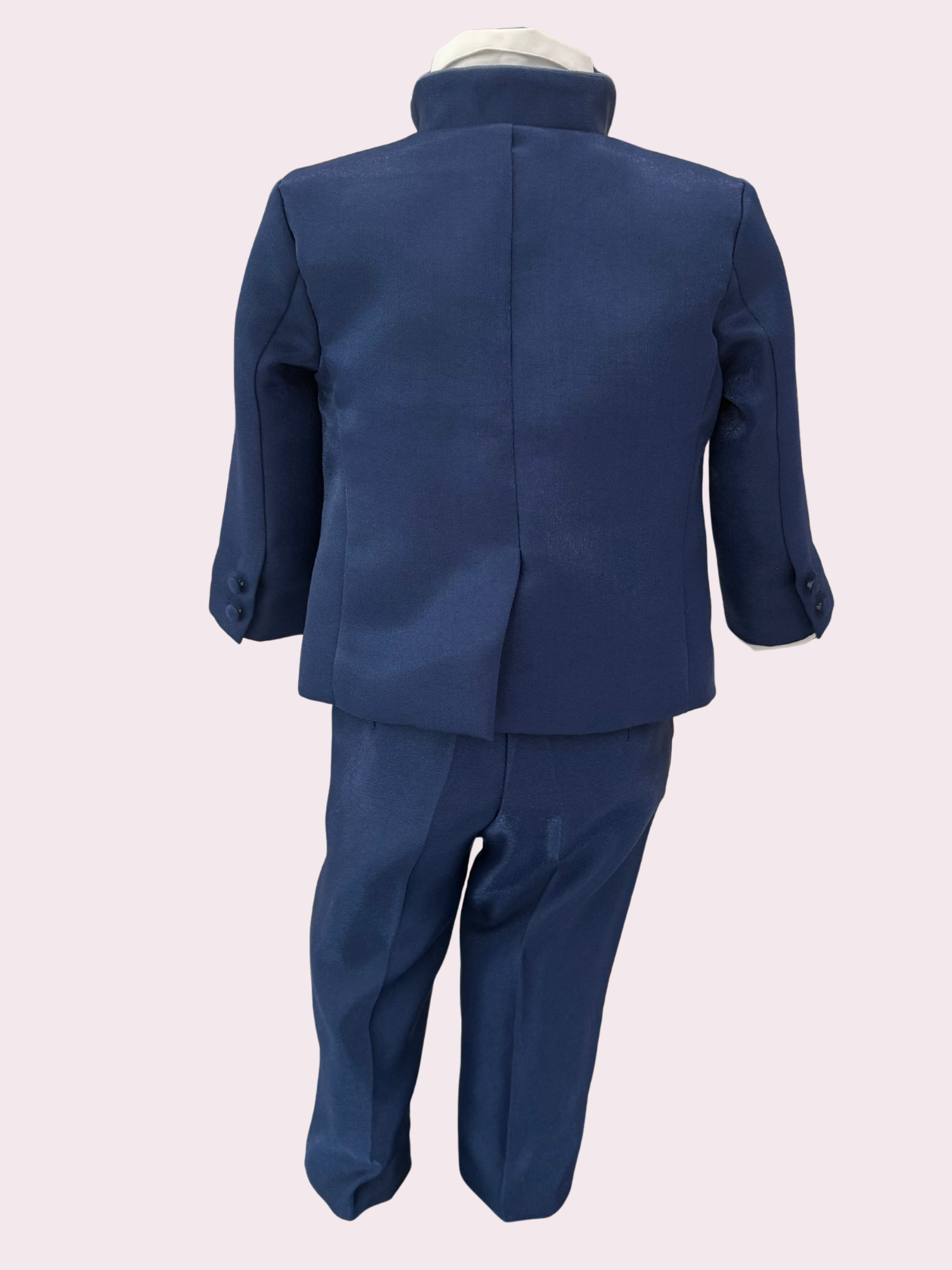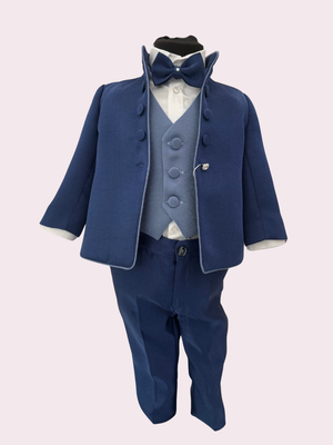 Un abito battesimale che lascia sognare, composto da giacca alla coreana in mikado con chiusura catenina e punti luce, pantalone e papillon con punto luce, gilet satinato e camicia in cotone. Completa il look la coppola abbinata. Made in Italy. Disponibile da 6 mesi a 3 anni. Contattaci per ulteriori taglie.