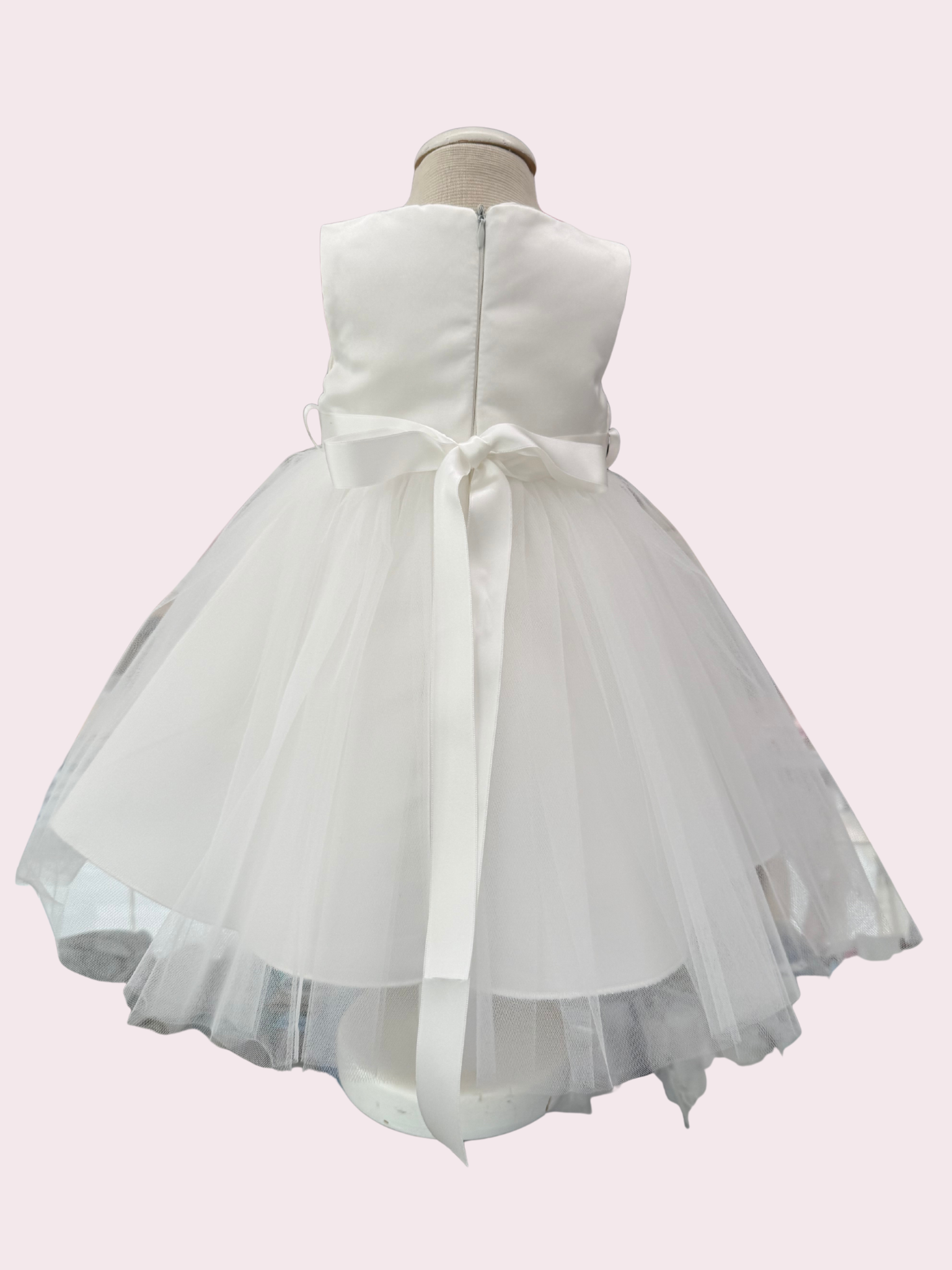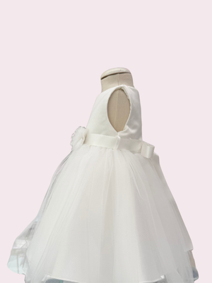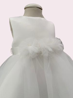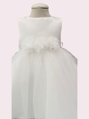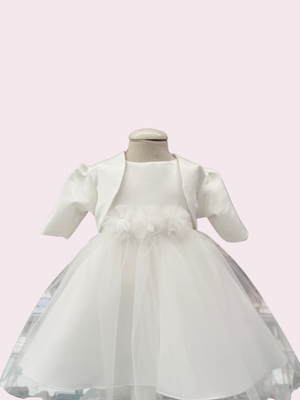 Un elegante abito total white in corpino effetto seta e gonna in tulle, con applicazione tulle sul girovita. Bolerino effetto seta e fascia abbinati.