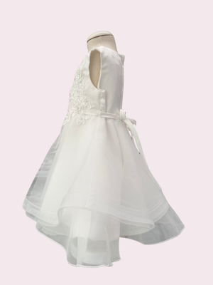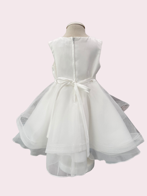 Abito in tulle con gonna a balze e ricamo e strass sul corpino.