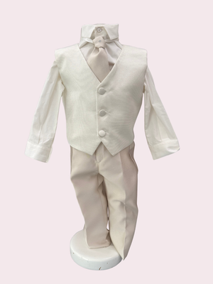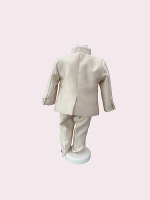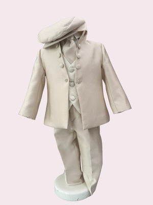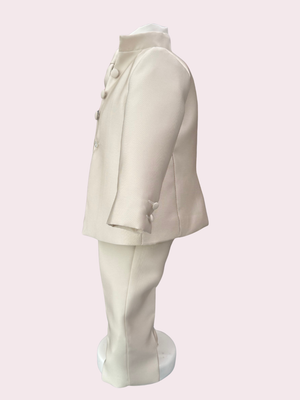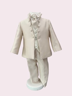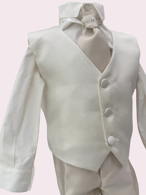 Un abito battesimale che lascia sognare, composto da giacca alla coreana in mikado con chiusura catenina e punti luce, pantalone e cravatta con punto luce, gilet satinato bianco e camicia in cotone. Completa il look la coppola abbinata. Made in Italy. Disponibile da 6 mesi a 3 anni. Contattaci per ulteriori taglie.