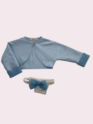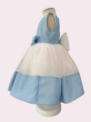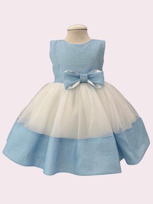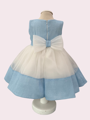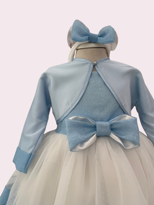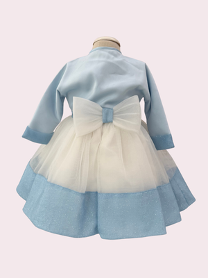 Abito con corpino lurex azzurro, fiocco in vita double lurex, gonna in tulle sposa color seta con balza saten di raso in lurex azzurro. Bolerino e fascia abbinati. Abito sartoriale Made in Italy.