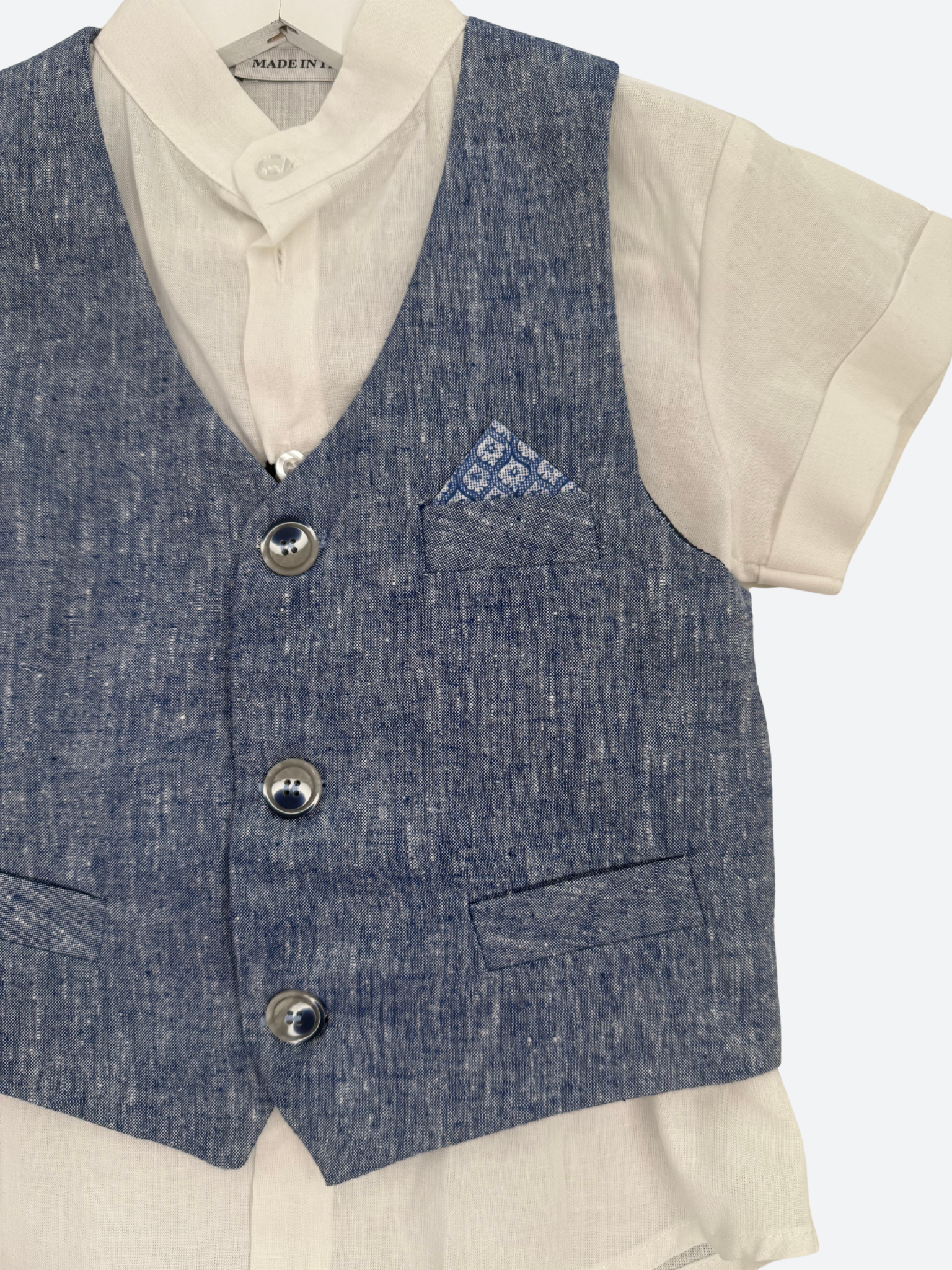 Linen-effect cotton suit consisting of elasticated trousers, waistcoat with fake pocket square, and short-sleeved Korean collar shirt