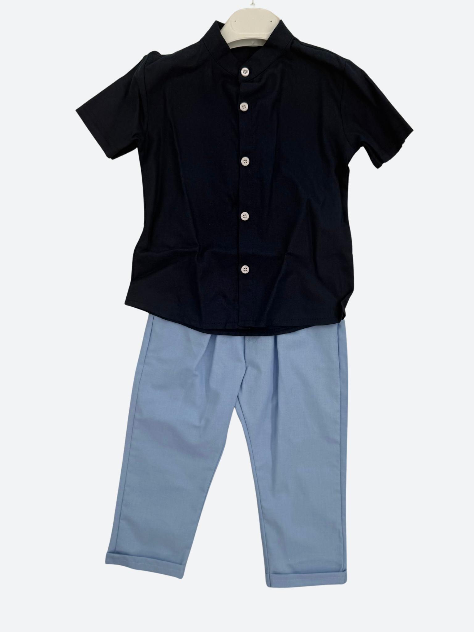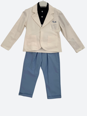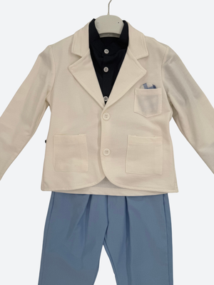 Outfit composed of a Korean-collared short-sleeved shirt, a white cotton jacket with a faux pocket square, and stretch trousers