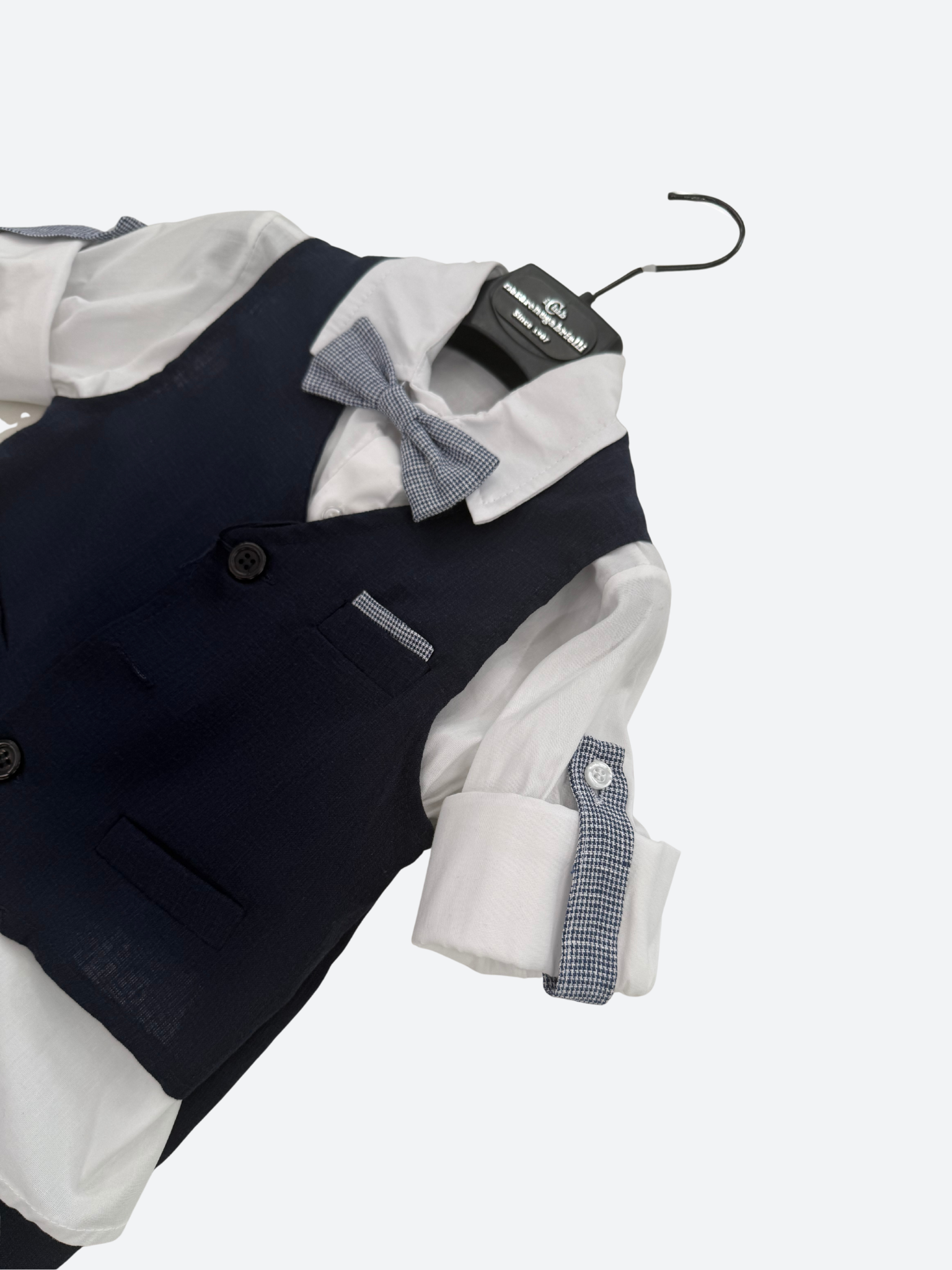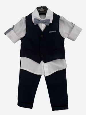 Cotton linen-effect suit, consisting of a waistcoat, long-sleeved shirt with a bow tie, and elasticated trousers