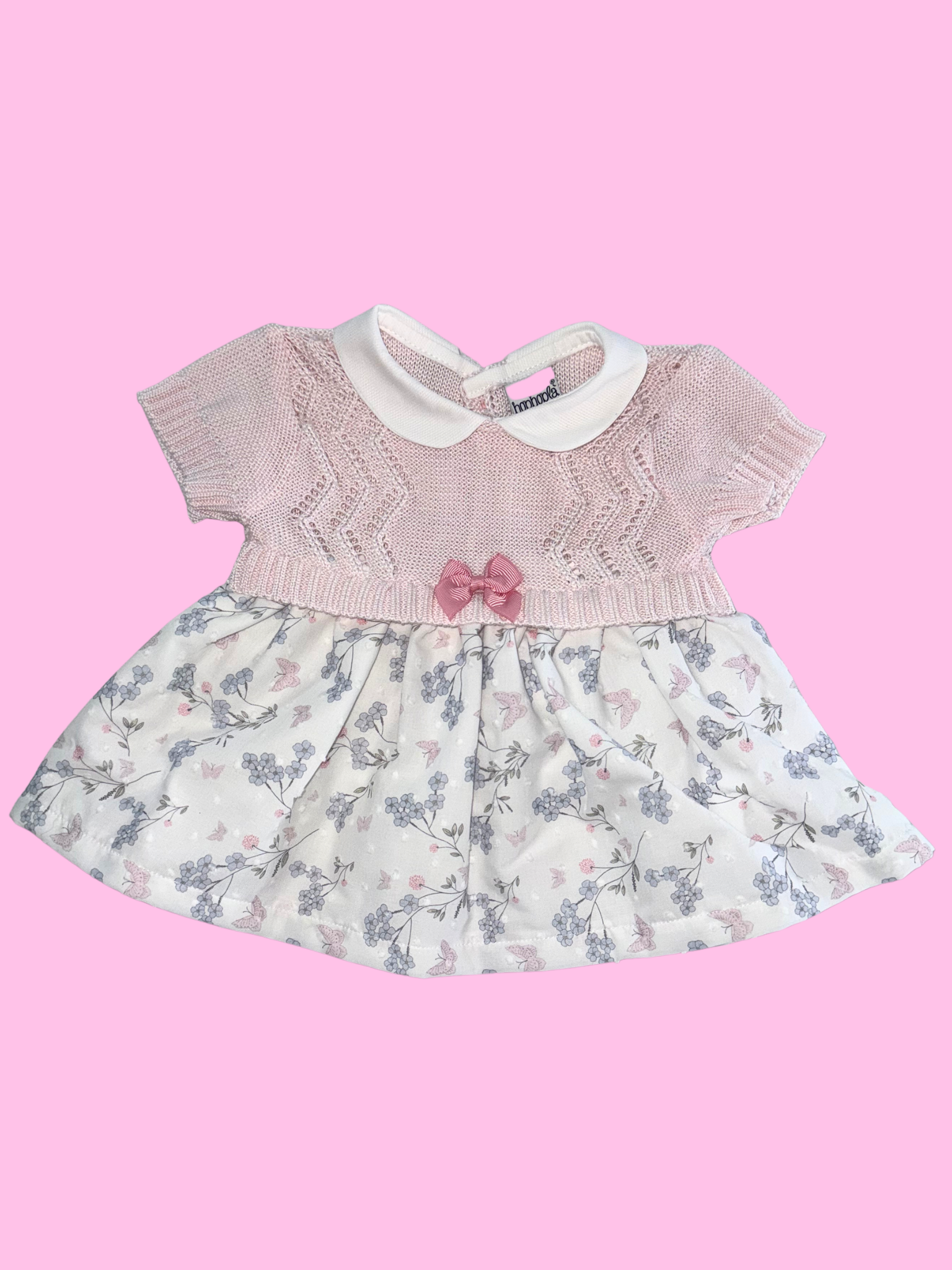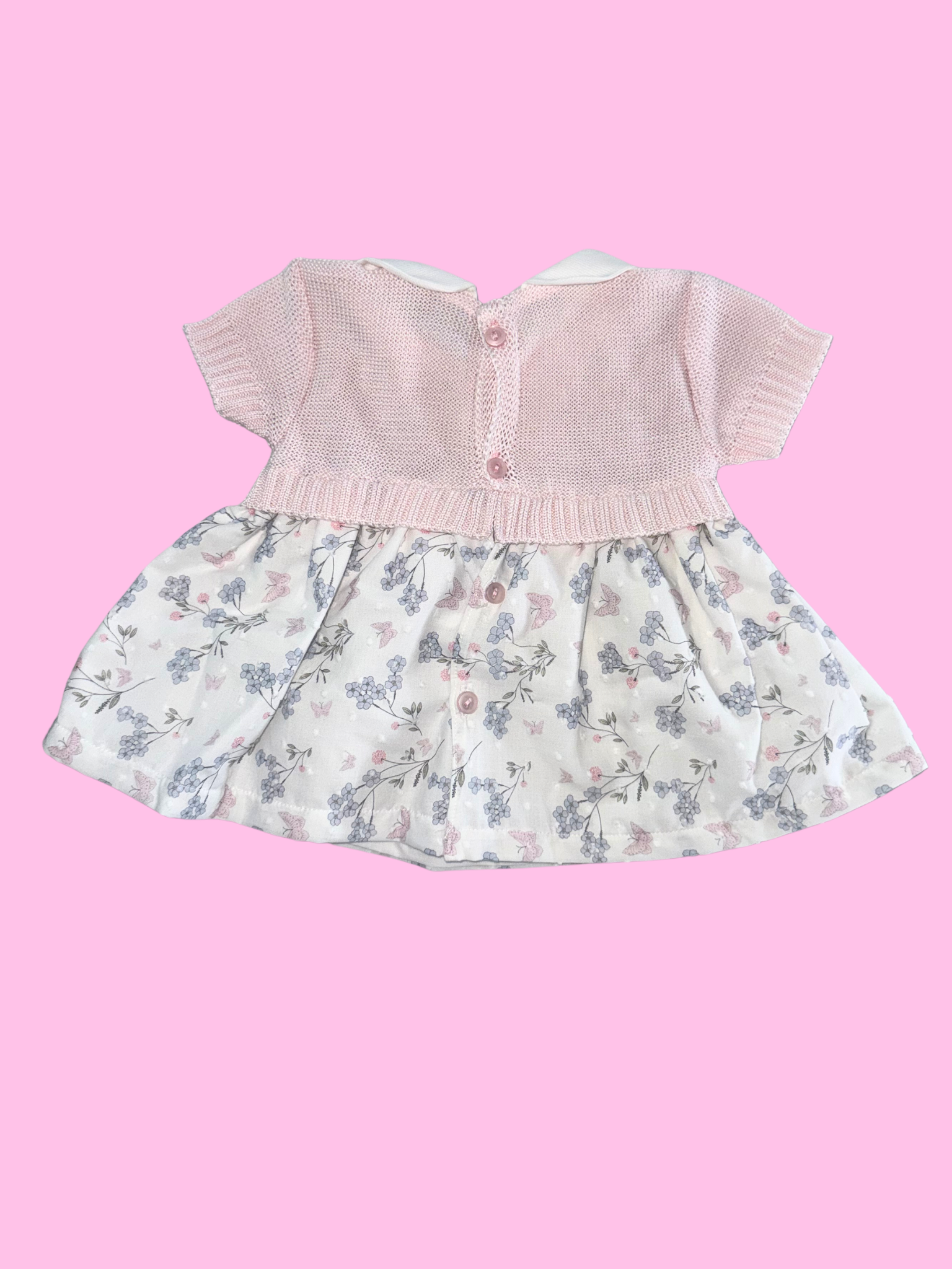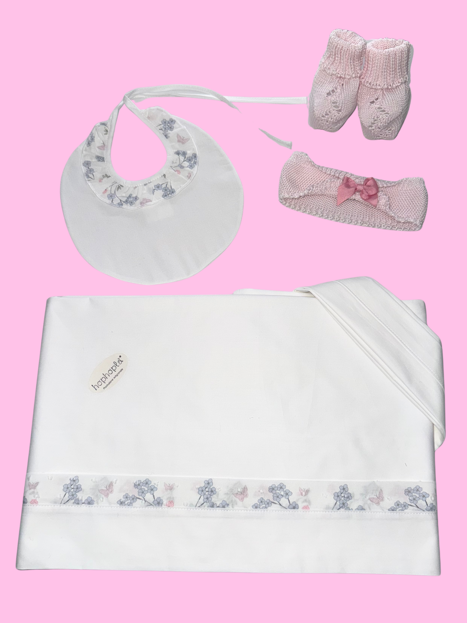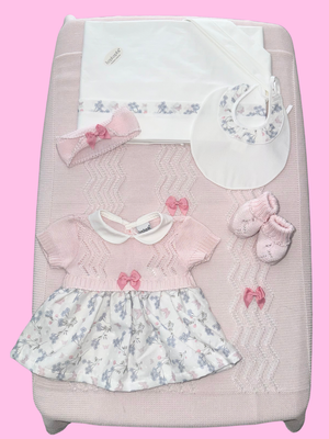 This cotton yarn newborn layette set is ideal for spring and summer, light, breathable and gentle on little ones' sensitive skin. The set includes a dress with a perforated cotton yarn bodice and a cotton skirt with a floral pattern, a matching blanket, sheets, booties, headband, and bib, to create an elegant and comfortable look at the same time.