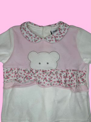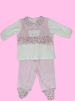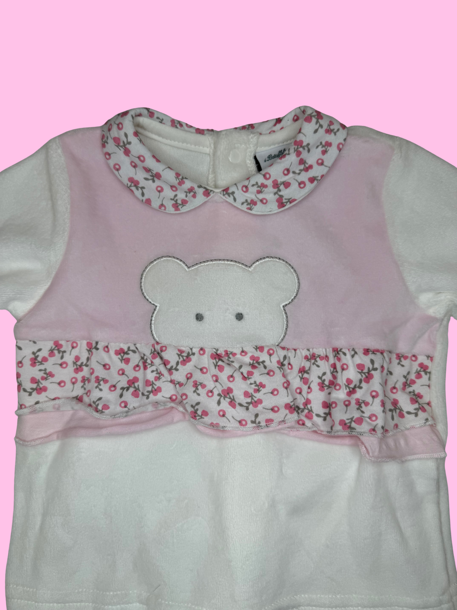 Delicate baby girl set made of soft chenille, ideal for providing warmth and comfort in cooler months. The set consists of a long-sleeved top with a rounded collar and a front bear application, enriched with a ruffled floral band that adds a refined touch. The coordinated trousers, with feet and floral accents, complete the look with harmony and sweetness.