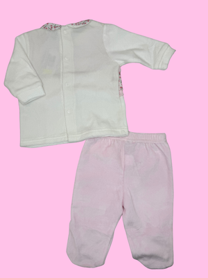 A set designed to envelop your baby girl in a feeling of softness, perfect for relaxing moments and first outings with a refined and delicate style.