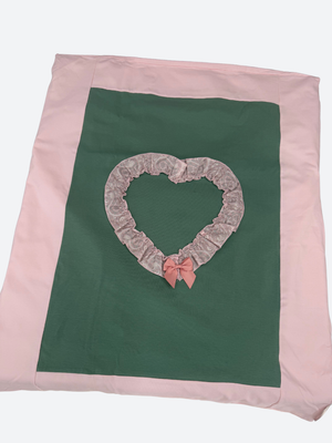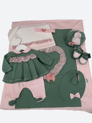 A 100% Made in Italy cotton set including: a two-piece outfit with pink trousers and green t-shirt with an appliqué, matching pram blanket and sheet set, booties, hat, headband, and bib