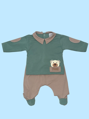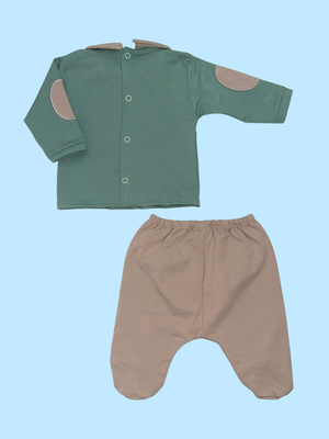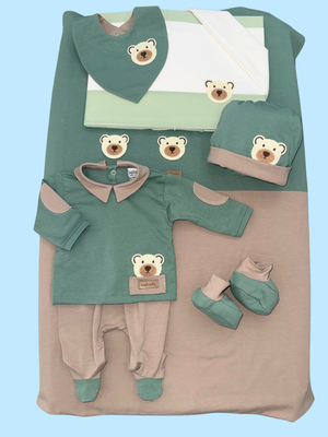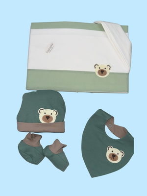 This cotton first-birth set is ideal for spring and summer, lightweight, breathable, and very gentle on a newborn's skin. The set includes a two-piece outfit, coordinated blanket and fitted sheet, hat, booties, and bib.