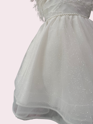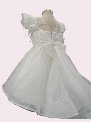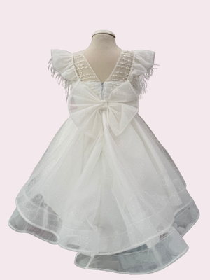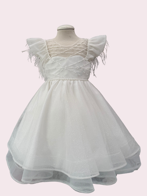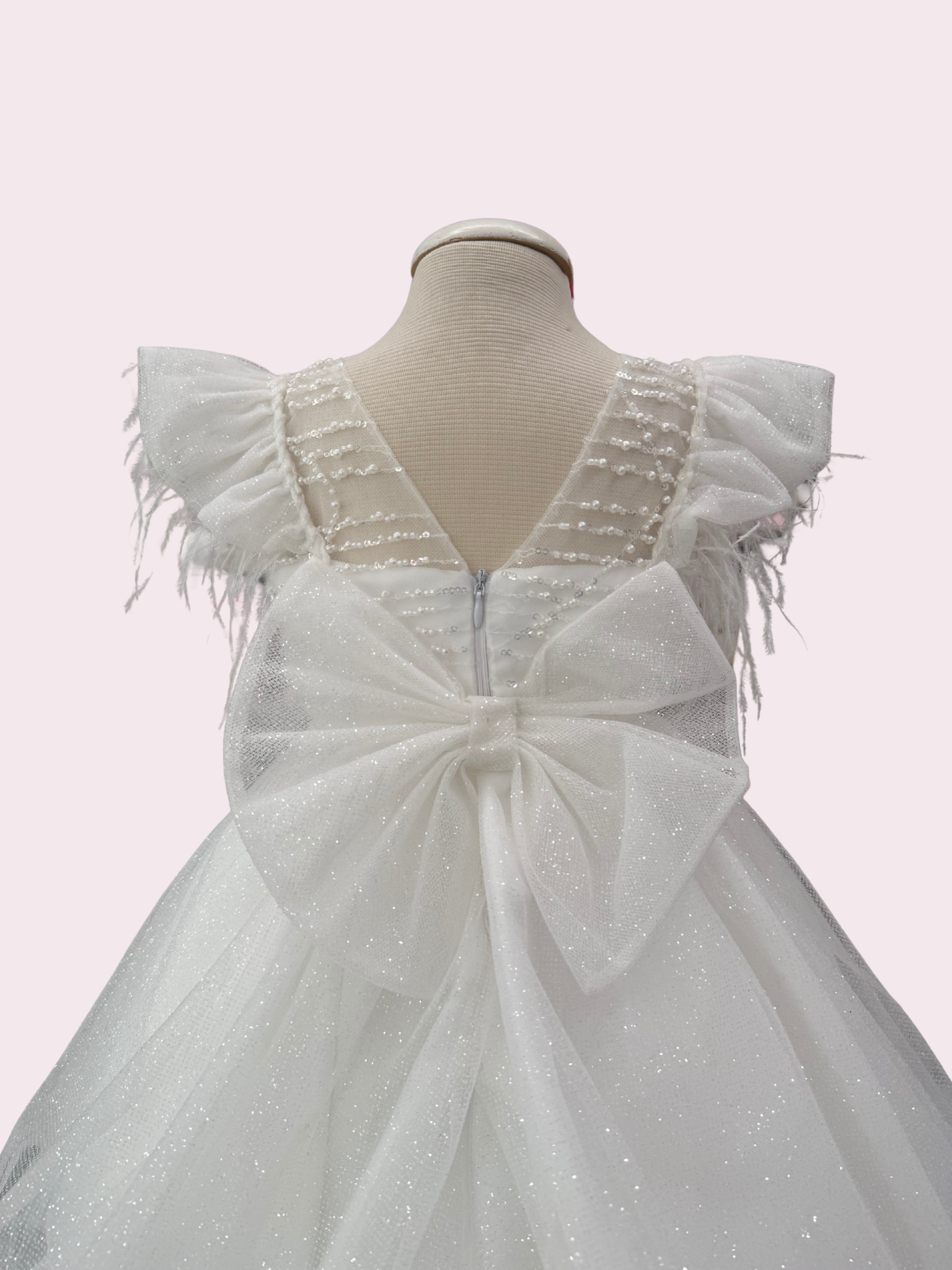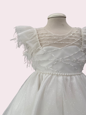 L'abito Cèline farà sognare la tua bambina nel suo giorno importante. Balza a ruota intera con coda in tulle sposa brillè, corpino in pizzo con intreccio in Madreperla e scollo a cuore in trasparenza. I dettagli, quali piume di struzzo nel giromanica accompagnate da maniche e fiocco in tessuto brillè, lo hanno reso un abito unico nel suo genere. Fascetta inclusa. Abito sartoriale Made in Italy.